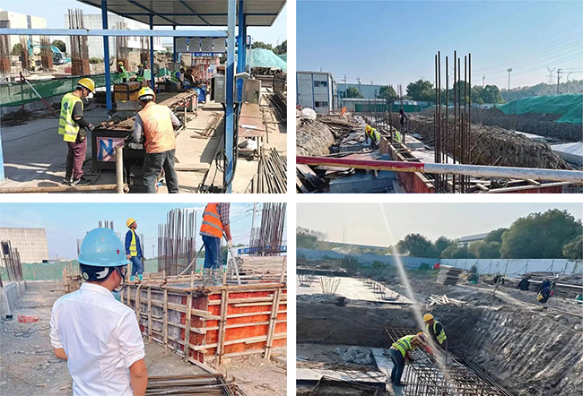 区环卫基础设施项目正处于基础施工阶段,项目现场,施工人员都戴着安全帽在各自的工作岗位上忙碌,忙着扎钢筋、搭建模板、灌浆混凝土等,现场焊接声、切割声、捶打声等各种声音交织成一首“施工交响曲”,到处是一片热火朝天的忙碌景象。