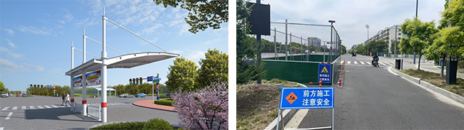 新建遮阳挡雨棚项目效果图(左)与现场图(右)