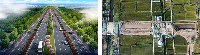 东环路南延二期项目效果图(左)与现场俯瞰图(右)