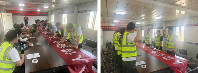 在盐洛高速步凤互通项目会议室,项目安全负责人结合“安全生产月”活动方案要求,对“安全生产月”工作进行了详细部署;随后,全体与会人员高举右手,进行了庄严宣誓,展示了大家对于安全生产工作的坚定信念和决心,并在“人人讲安全、个个会应急——畅通生命通道”的主题条幅上郑重署名。